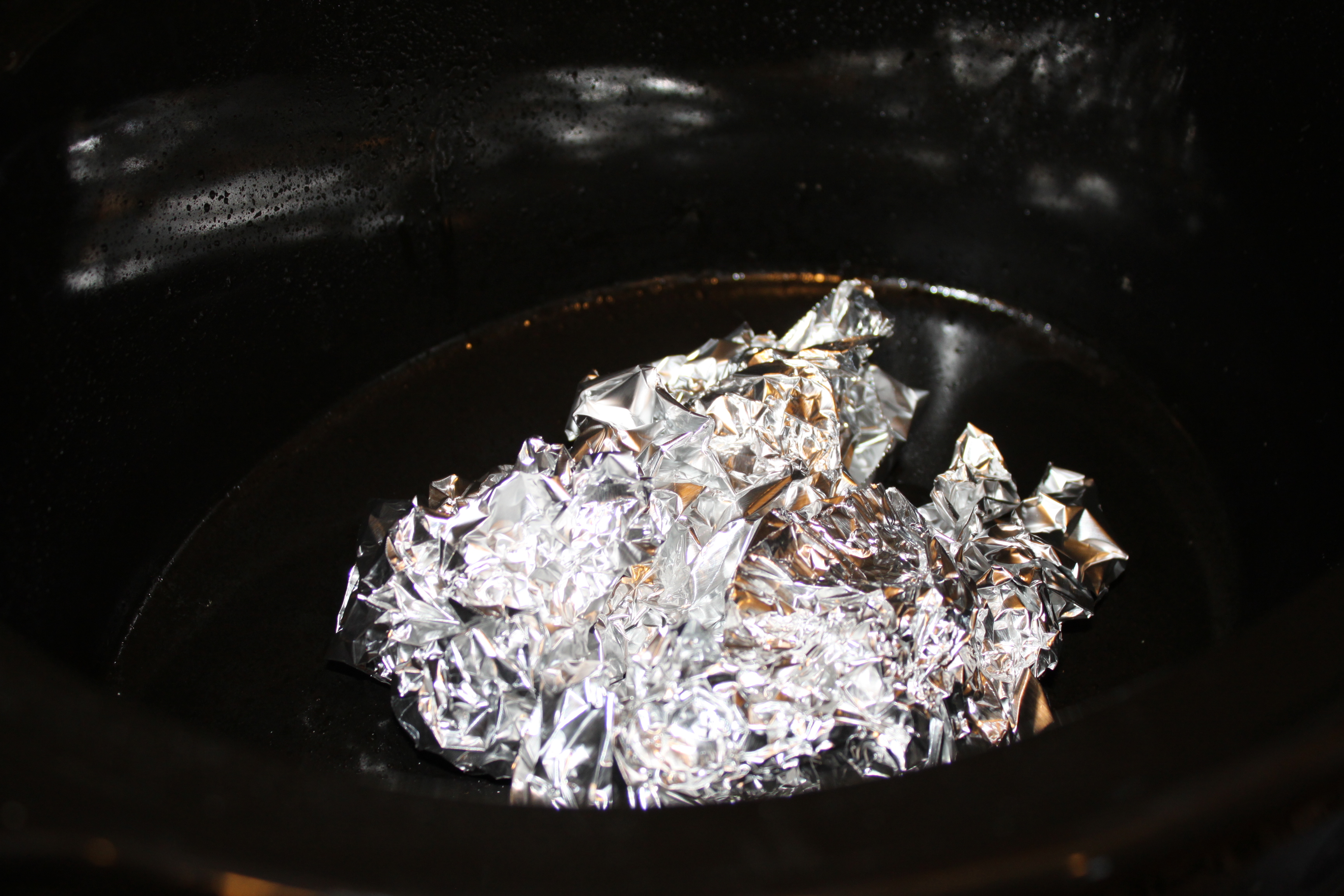 Spray your crock pot with cooking spray. Make two balls of crippled aluminum foil and place in the crockpot.