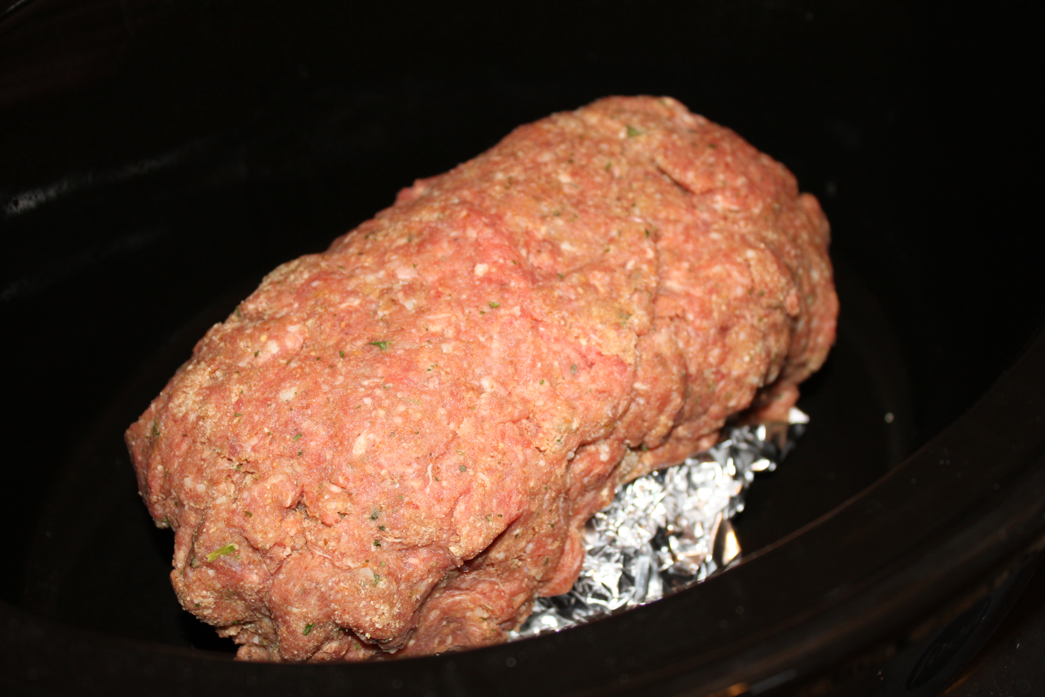 Place on top of foil in crock pot. Pour 1/4 cup sauce on top of meatloaf. I use leftover sauce from pasta night which is usually twice a week in our house. If you don’t have sauce you can always use jared sauce or add the same seasoning as you did to the meatloaf to a can of tomato sauce. Set crock pot for 6 hours on low.