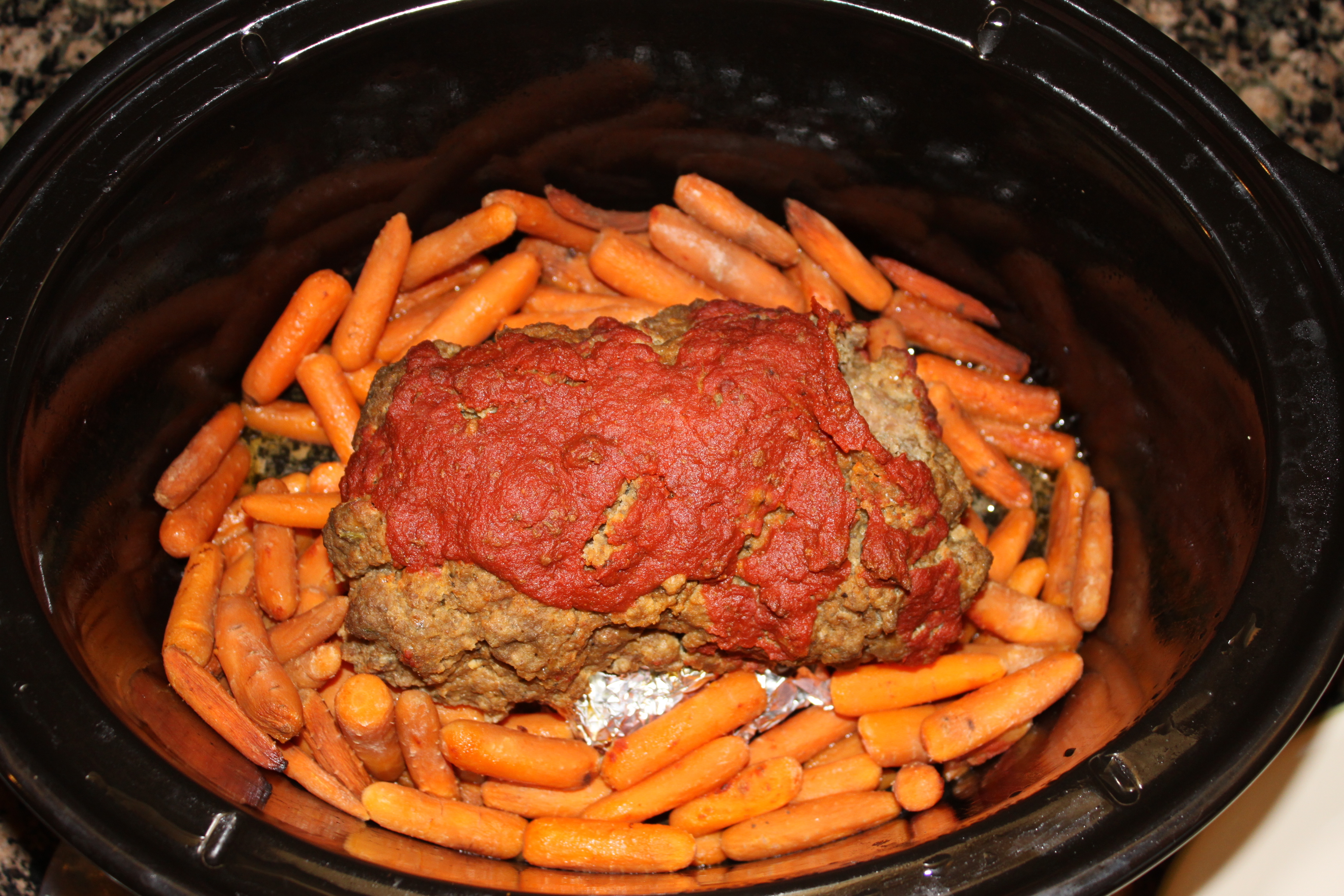 To start spray your crock pot with cooking spray. Make two balls of crippled aluminum foil and place them in the crockpot. I do this so that I can add water to cook veggies with the meatloaf, otherwise I would have soggy meatloaf. You can add any sturdy crockpot veggies you wish. I happened to have a giant bag of organic baby carrots so I used those. I would have added potatoes too but I was out.